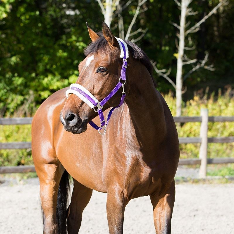 Quality halter padded in soft fleece at the noseband and crown with satin finish buckles, adjustable snap hook at throat, and Horze Platinum name across the browband. 100% polyester.