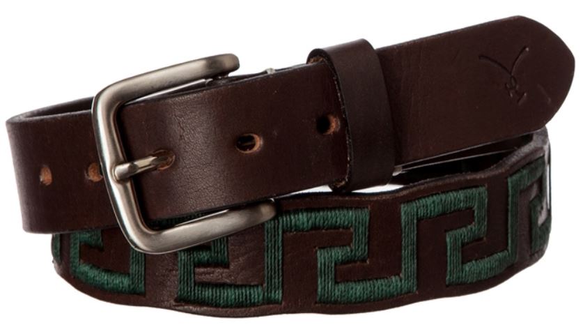 This particular model is a Havana brown leather with a hunter green Greek pattern.
